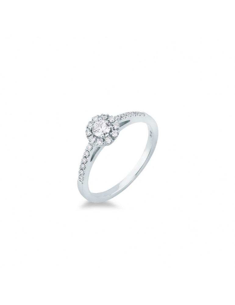 Anello Solitario Fantasia misura 15 in Oro Bianco 18KT con Diamanti, Taglio Brillante, composto da un Brillante centrale con contorno di brillanti che proseguono sul gambo. Questa versione LF427/50 monta diamanti per un totale di 65 punti di carato (Ct. 0,65), color G, purezza VS. L'anello solitario è l'anello perfetto per celebrare l'amore per la propria partner. E' il gioiello ideale per la proposta di matrimonio poichè il diamante simboleggia un amore indistruttibile, in grado di resistere ad ogni difficoltà. E' anche un'idea regalo idonea per celebrare un momento importante come la nascita di un figlio o un anniversario.