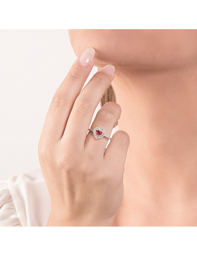 Anello donna Mirco Visconti ABA1047/5R con rubino centrale a forma di cuore per un totale di 41 punti di carato (Ct. 0,41) provenienza Birmania, impreziosito da contorno di diamanti taglio brillante per un totale di 20 punti di carato (Ct. 0,20) colore G, purezza VS, in oro bianco 750 (18 carati kt).