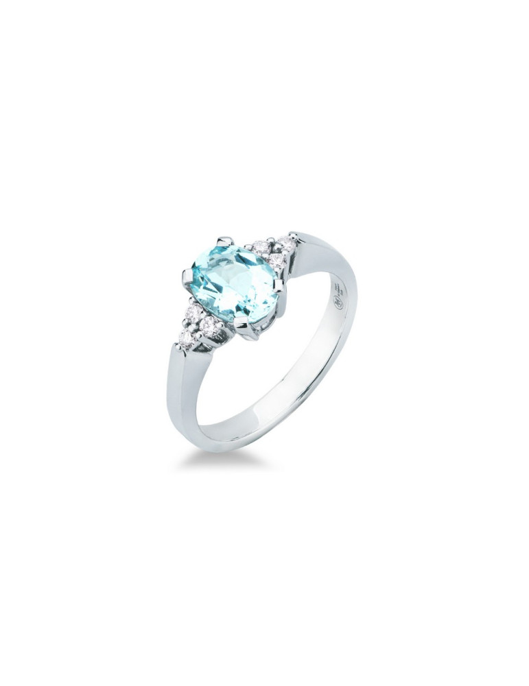 Anello fantasia Mirco Visconti LF259/10AC con acquamarina ovale per un totale di 119 punti di carato (Ct. 1,19) impreziosito da contorno di diamanti taglio brillante per un totale di 11 punti di carato (Ct. 0,11) colore G, purezza VS, in oro bianco 750 (18 carati kt).