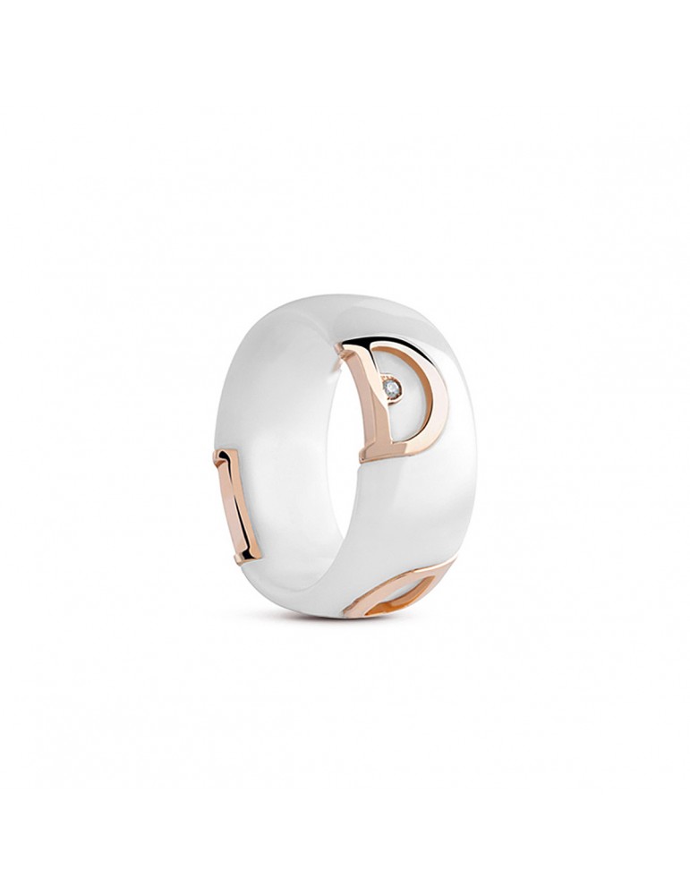 Anello misura 12 in oro rosa e ceramica bianca: il colore è messo ancora più in risalto dai quattro elementi in oro rosa 18 kt a forma di D che ricordano il logo della maison. Su una delle D inoltre è stato montato un diamante colore GH da 0.01 carati. L’innovativa ceramica lucida, l’oro e i diamanti che impreziosiscono anelli e pendenti della collezione D.Icon donano carattere e pregio a questo straordinario prodotto made in Italy. Un regalo per perfetto per la donna moderna e che ama indossare gioielli glamour e di classe. Un compleanno, un anniversario o anche una laurea, risulteranno indimenticabili con un gioiello che, come dice lo stesso nome, è oramai un'icona della gioielleria moderna.