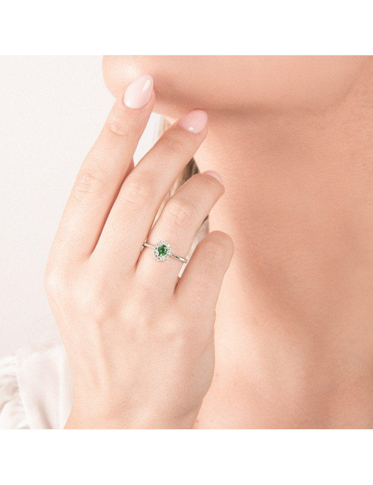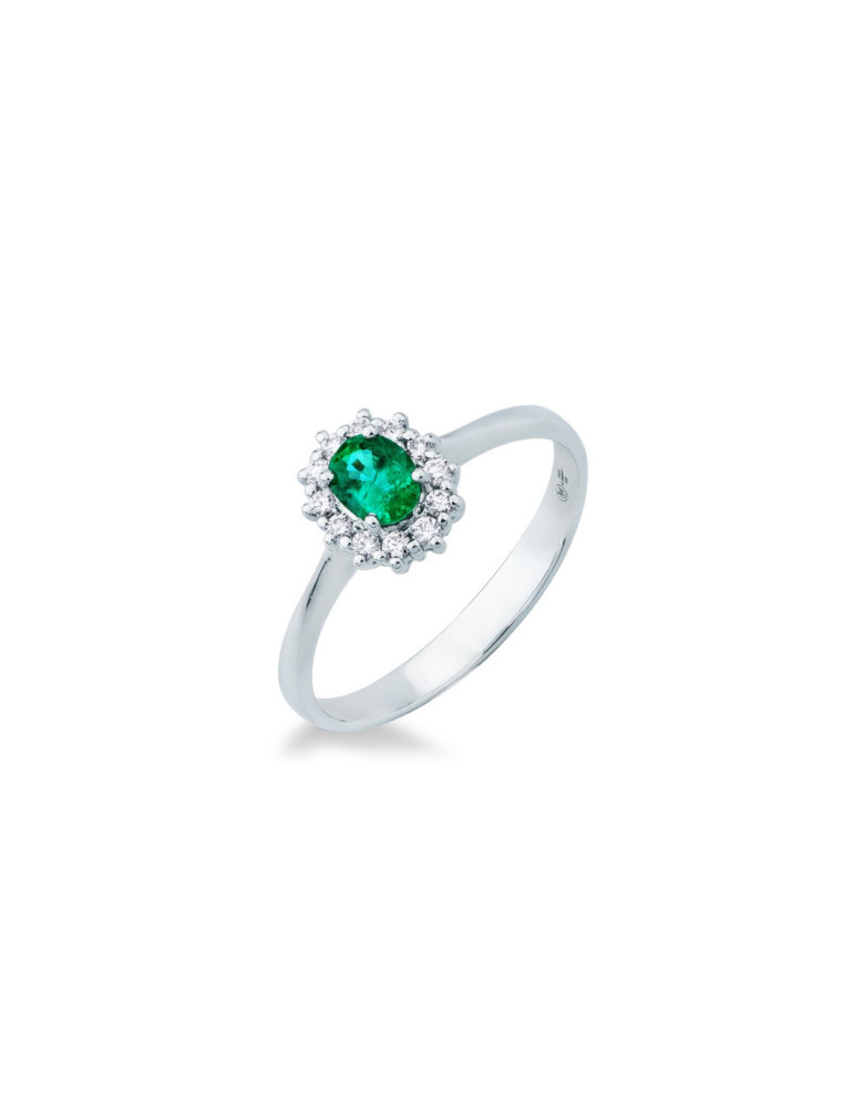 Anello Mirco Visconti DL4/B5S in oro bianco 18kt con diamanti naturali di forma tonda taglio a brillante 0,14 carati color G purezza VS; smeraldo naturale provenienza Zambia, di forma ovale, incassato a griffe da 0,30 carati.