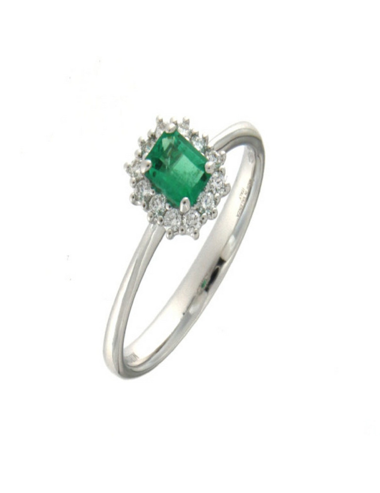 Anello fantasia Mirco Visconti Z681/B10SE con smeraldo ovale per un totale di 43 punti di carato (Ct. 0,43), impreziosito da contorno di diamanti taglio brillante per un totale di 21 punti di carato (Ct. 0,21) colore G, purezza VS, in oro bianco 750 (18 carati kt).
