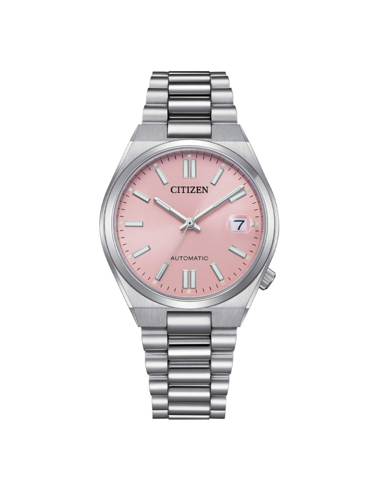 Orologio automatico della collezione Tsuyosa con quadrante rosa. Cassa e bracciale in acciaio. Fondo con oblò trasparente e movimento a vista. Vetro zaffiro con lente sul quadrante. WR 5 bar. Movimento meccanico a ricarica automatica con riserva di carica di 40 ore. Questa nuova versione con quadrante da 37 mm rappresenta l'orologio unisex per eccellenza. L'orologio ideale per festeggiare un compleanno, un anniversario o semplicemente per il gusto di sorprendere: Citizen con il suo iconico stile, non mancherà di stupire. Idea regalo testimone di nozze.
