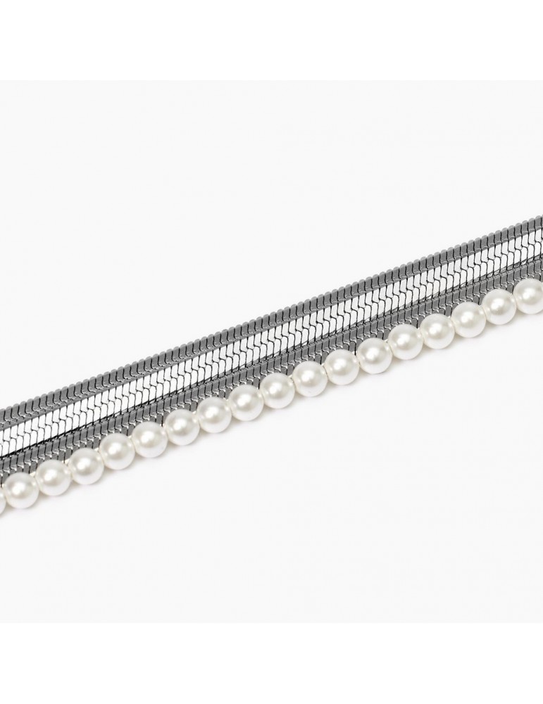 Bracciale regolabile con catena herringbone in acciaio e perle conchiglia.