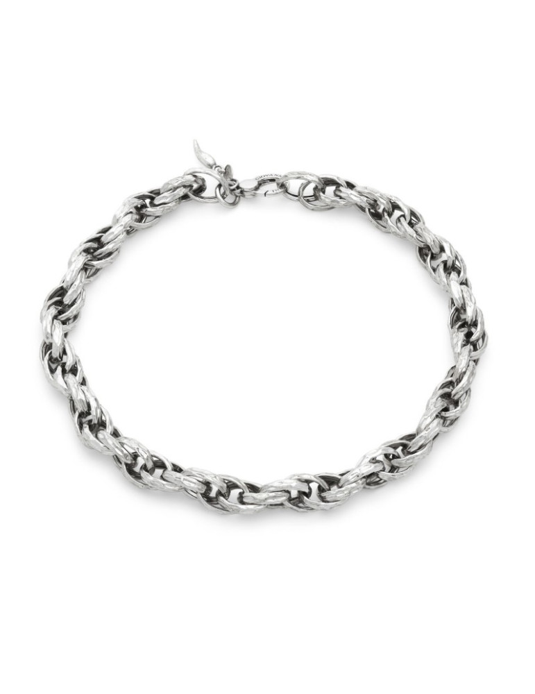 Giovanni Raspini sceglie una catena in argento martellato ad intreccio torchon, e la trasforma in una collana raffinata e di grande impatto. L'effetto martellato amplifica la rifrazione della luce, valorizzando l'elegante texture realizzata a mano in azienda.