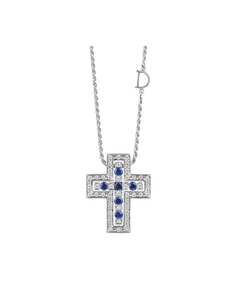 Collierino Croce 23x19mm della collezione Belle Epoque in oro bianco, diamanti (ct. 0,29 color GH) e zaffiri (ct. 0,42).