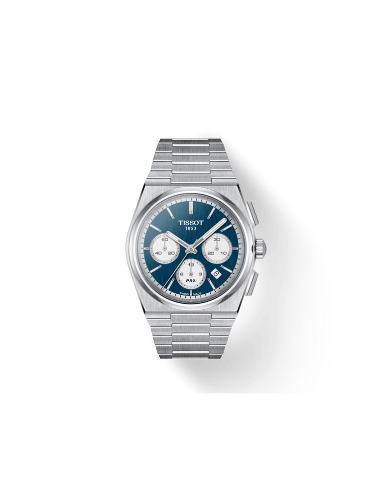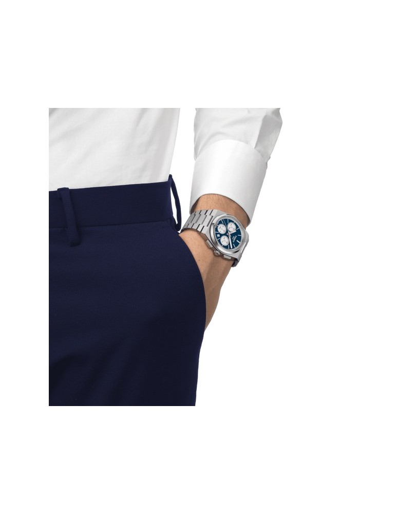 The PRX collection expands with the Tissot PRX automatic chronograph. Its iconic design of the 1970s has conquered watch lovers looking for authenticity. With a diameter of 42 mm, the satin steel case and its integrated bracelet, this chronograph fits all wrists and all occasions. The blue dial and white counters give elegance and character to this timepiece. With the Valjoux A05.H31 movement, renowned for its reliability and precision, the Tissot PRX Automatic Chronograph combines design and performance. With its 60 hour power reserve, this watch will accompany you in all stages of your life. The perfect gift for the class man who loves vintage and timepieces with integrated bracelet. Wedding gift idea.