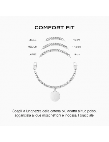 •The \"comfort fit\" system allows you to easily adapt the bracelet to your wrist in a comfortable and elegant way.Choose the chain length best suited to your wrist, hook it to the two snaps and wear the bracelet.