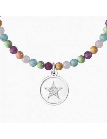 Elastic bracelet with multicolor stones and round pendant in satin steel with crystals and \"Happy graduation\" writing.