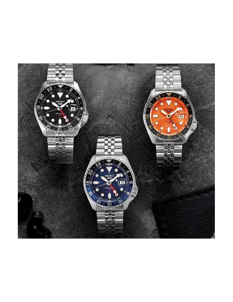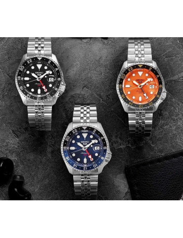 The Seiko 5 sports series welcomes the new GMT SKX watches. The SSK003K1 is conveniently equipped with a two-tone blue/black swivel bezel graduated over 24 hours to allow reading an additional time zone distinguishing day and night. Powered by an automatic caliber made by Seiko, this stainless steel watch is 10 bar waterproof and has a transparent case back. This beautiful version with blue dial represents the perfect gift for the sporty and character man and who loves to travel.
