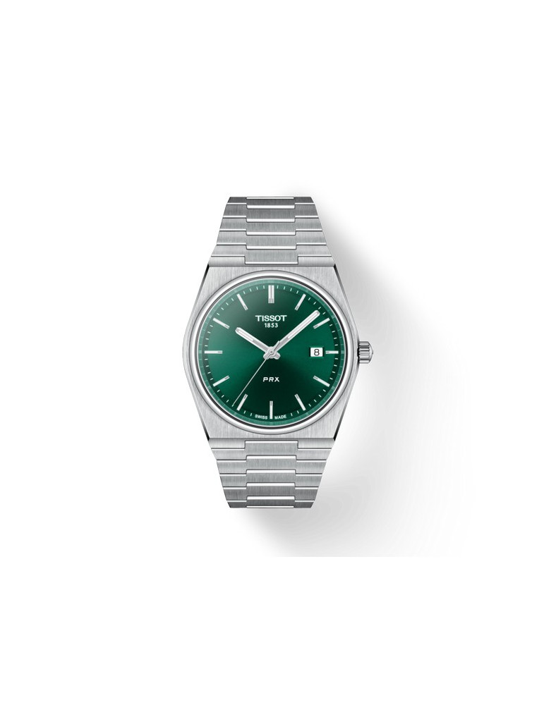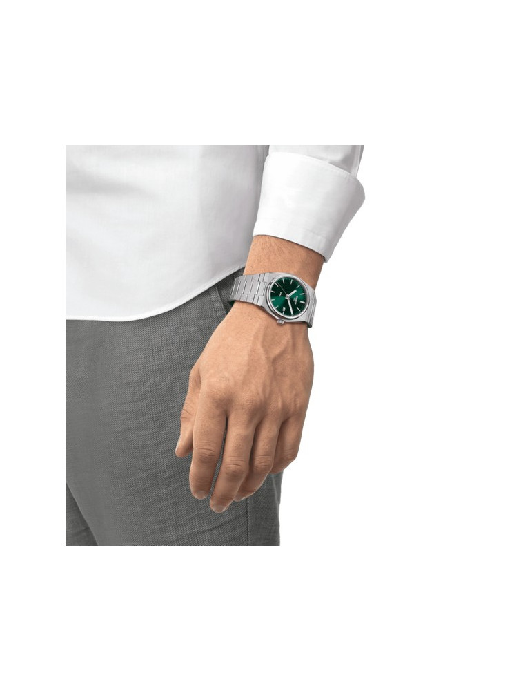 In 1978 Tissot created a quartz model, characterized by a thin case, narrow indexes and a steel bracelet. Its wide horizontal loop, typical of the time, was perfectly integrated in the flat case in the shape of a tonneau. A few years later, Tissot registered the PRX name. "PR" stands for "precise" and "robust". The "X" stands for the Roman number ten and for the pressure of 10 bar that the clock is able to endure. In 2021 Tissot presented the PRX 40205, It is a modern version of the previous model. The Tissot PRX 40205 316L stainless steel case has a diameter of 40 mm. It has a slightly tonneau shape and is decorated with a narrow and round bezel. On the sides, brushed vertically, rounded finishes alternate with glossy facets. This version of the Tissot PRX 40205 Quartz features a green dial with silver markers and hands. The flexibility and softness of the mesh make it a real success of ergonomic design and convey an extraordinary comfort. The PRX 40 205 hands are equipped with a SuperLumiNova® coating and are placed on each other with a minimum space. This allows you to approach the dial to the watch glass. The optical effect obtained by Tissot designers makes the watch case look even flater and thinner than it actually is. The perfect gift for the class man who loves vintage and timepieces with integrated bracelet. Wedding gift idea.