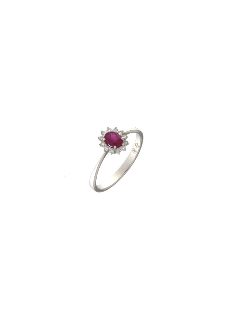 Anello fantasia Mirco Visconti LF457/B5R con rubino ovale per un totale di 41 punti di carato (Ct. 0,41) provenienza Birmania, impreziosito da contorno di diamanti taglio brillante per un totale di 12 punti di carato (Ct. 0,12) colore G, purezza VS, in oro bianco 750 (18 carati kt).