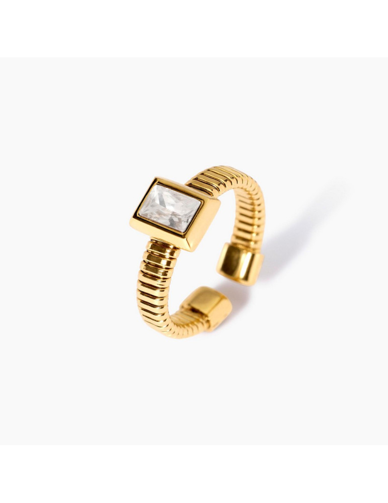 Anello tubogas in acciaio dorato con zircone bianco taglio baguette.