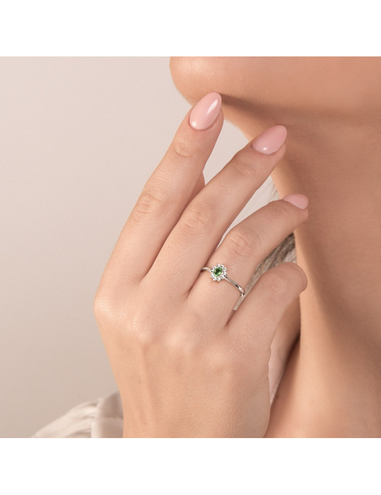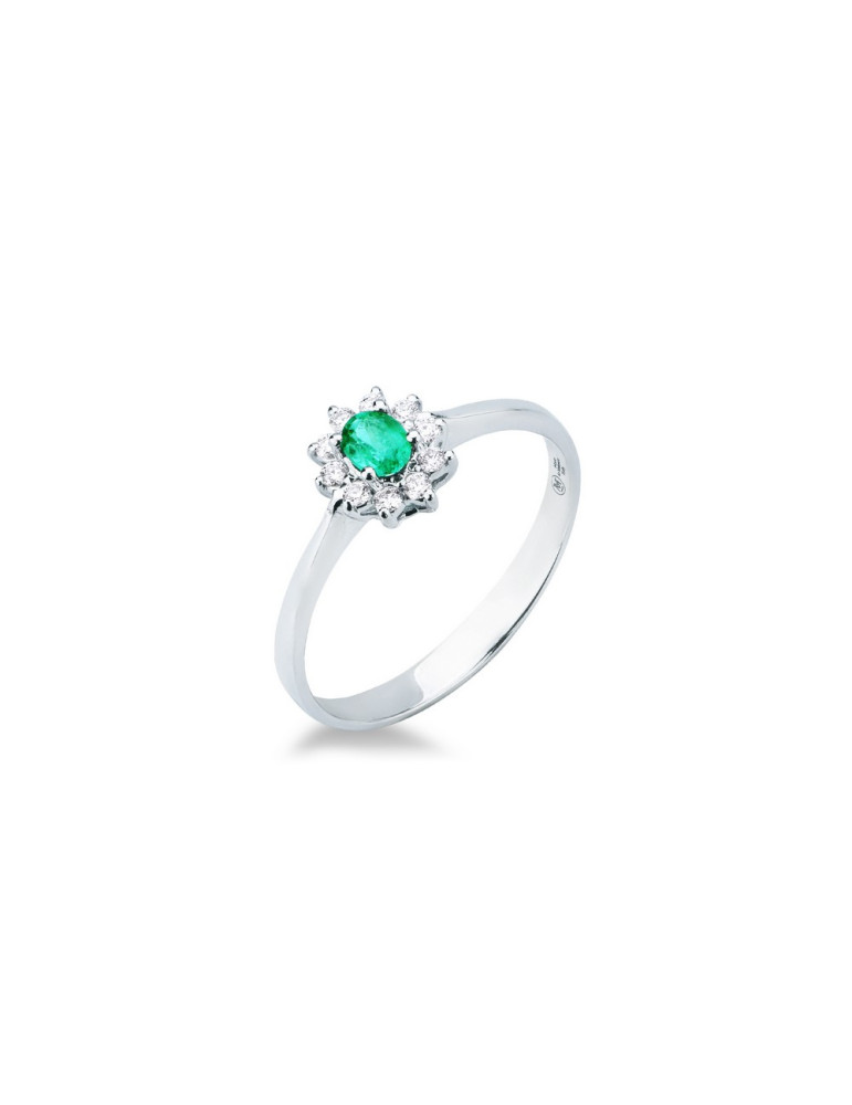 Anello Mirco Visconti DL1/A3S in oro bianco 18kt con diamanti naturali di forma tonda taglio a brillante 0,10 carati color G purezza VS; smeraldo naturale di forma ovale provenienza Zambia, incassato a griffe da 0,15 carati.