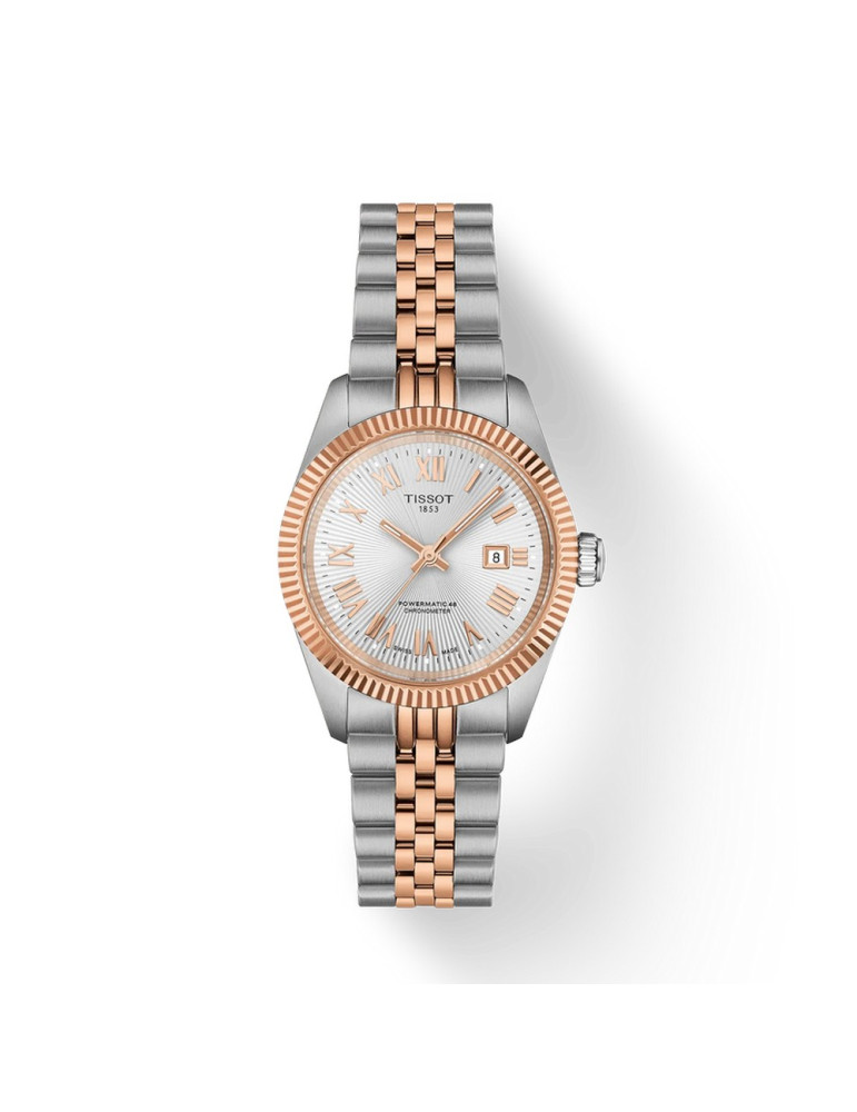 Il Ballade COSC è l'evoluzione di un modello con radici profonde nella collezione Tissot, reintrodotto nel 2024 e ora arricchito da prestazioni certificate cronometriche. Il suo cuore pulsante è il movimento Powermatic 80, ufficialmente riconosciuto per la sua precisione e affidabilità. La lunetta zigrinata definisce l'identità dell'orologio, con scanalature finemente intagliate che aggiungono profondità e carattere alla cassa. Il Ballade COSC unisce prestazioni certificate a dettagli estetici nitidi: un orologio che esprime la sua precisione con personalità. Questa splendida versione bicolor da 30 mm con quadrante silver rappresenta il regalo perfetto per il compleanno o la laurea di una donna di classe che ama la precisione e il design top della casa svizzera. Idea regalo per testimone di nozze.