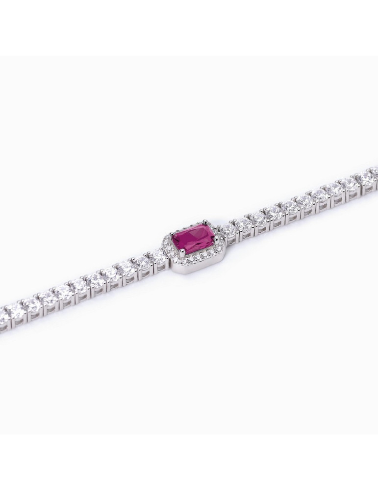Bracciale tennis da donna in argento rodiato con zirconi bianchi e castone centrale con rubino sintetico taglio baguette.