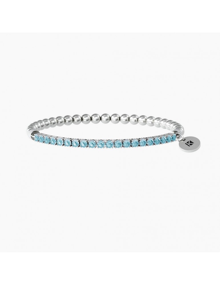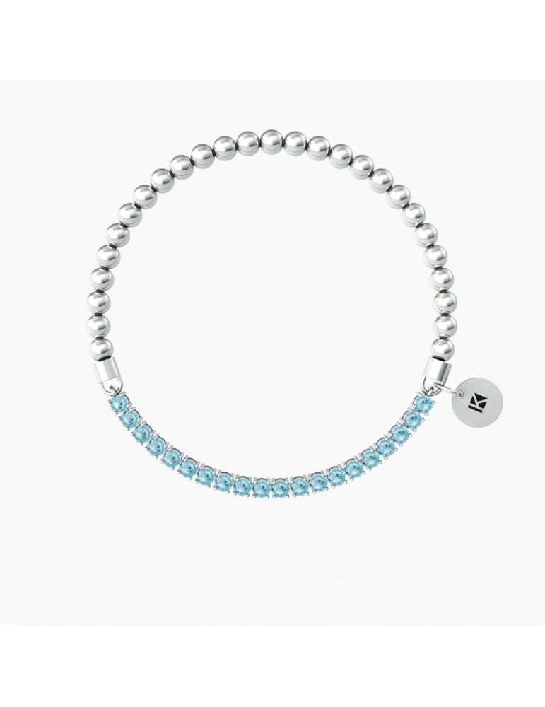 Bracciale elastico in acciaio con sfere lucide e tennis di zirconi azzurri.