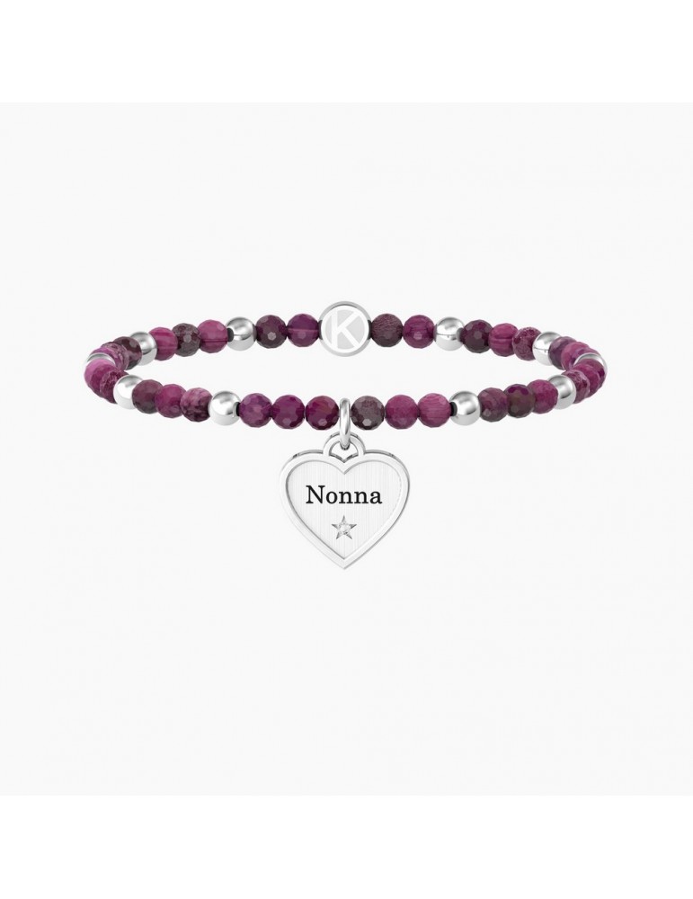 Bracciale elastico Nonna in acciaio con agata striata fucsia e ciondolo satinato a forma di cuore con cristallo bianco e scritta "Ti voglio bene".