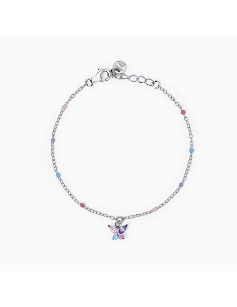 Bracciale regolabile da bambina in argento rodiato con catena forzatina, applicazioni smaltate e ciondolo a forma di farfalla in tormalina sintetica rosa e zirconi multicolor taglio a navette.