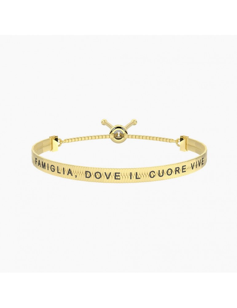 Bracciale da donna regolabile con catena veneta in herringbone e acciaio dorato lucido e satinato. Scritta "Famiglia, dove il cuore vive".