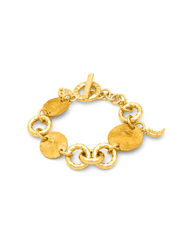 Il fascino inconfondibile della fusione a cera persa prende forma in un bracciale a maglia tonda in bronzo dorato con finitura martellata, impreziosito da eleganti dischi e da un artiglio. Luminosa e materica, questa creazione dalle calde cromie è completata da una chiusura a T-bar. Un gioiello fatto a mano, espressione dell’arte orafa e della maestria artigianale di Giovanni Raspini.