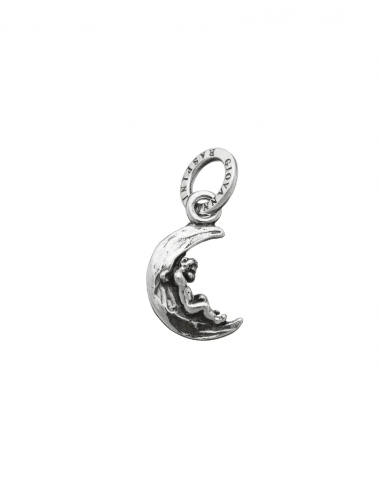 Charm della collezione Giovanni Raspini Cuori e Angeli da donna. Colore: argento. Il charm è in argento 925‰ a forma di luna con sopra Amorino, munito di maglina con logo. Peso: 2 gr. Altezza: 2,4 cm (esclusa maglina di 0,9 cm). I gioielli Giovanni Raspini sono interamente realizzati a mano in Italia.