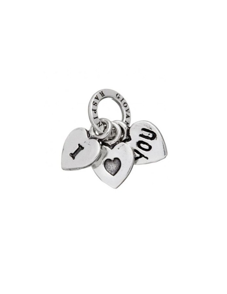 Charm della collezione Giovanni Raspini da donna. Colore: argento. Il charm è in argento 925‰ con tre cuoricini con frase incisa "I LOVE YOU". I gioielli Giovanni Raspini sono interamente realizzati a mano in Italia.