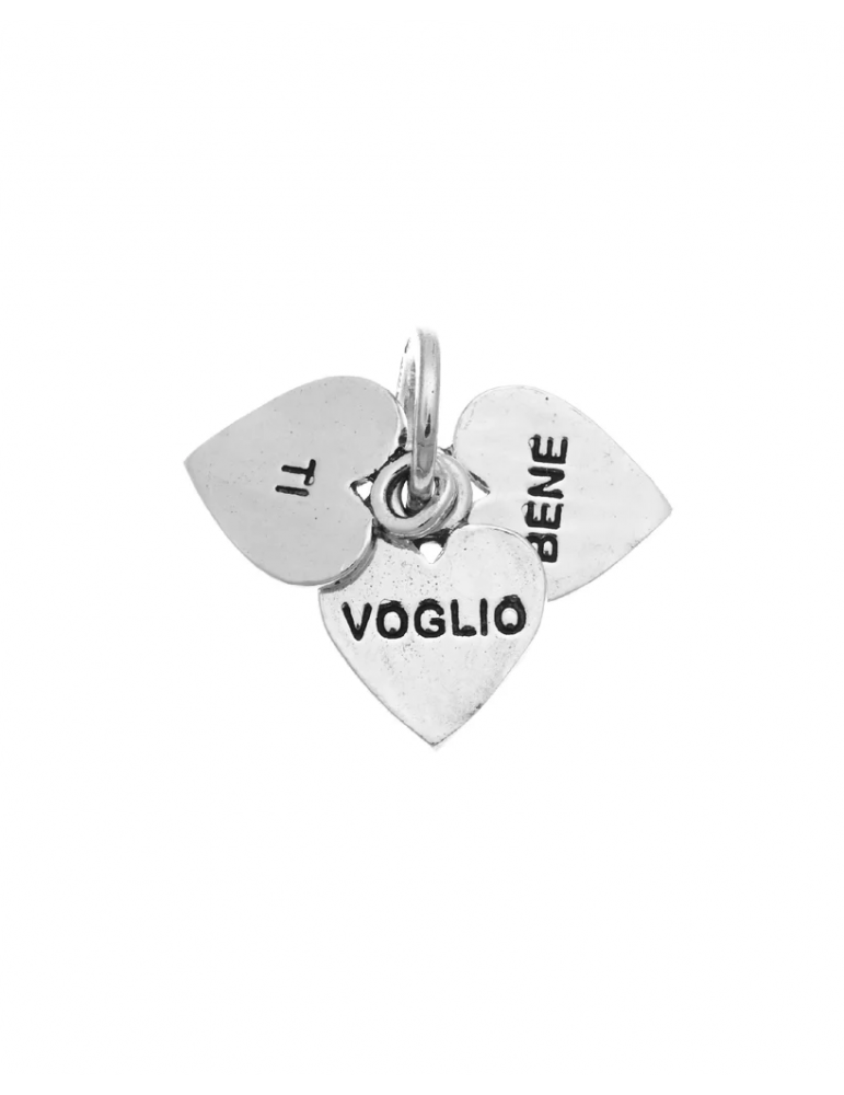 Charm della collezione Giovanni Raspini Bouquet unisex. Colore: argento. Il charm è in argento 925‰ composto da tre medagliette a forma di cuore con la scritta "Ti voglio bene", munito di maglina con logo. I gioielli Giovanni Raspini sono interamente realizzati a mano in Italia.