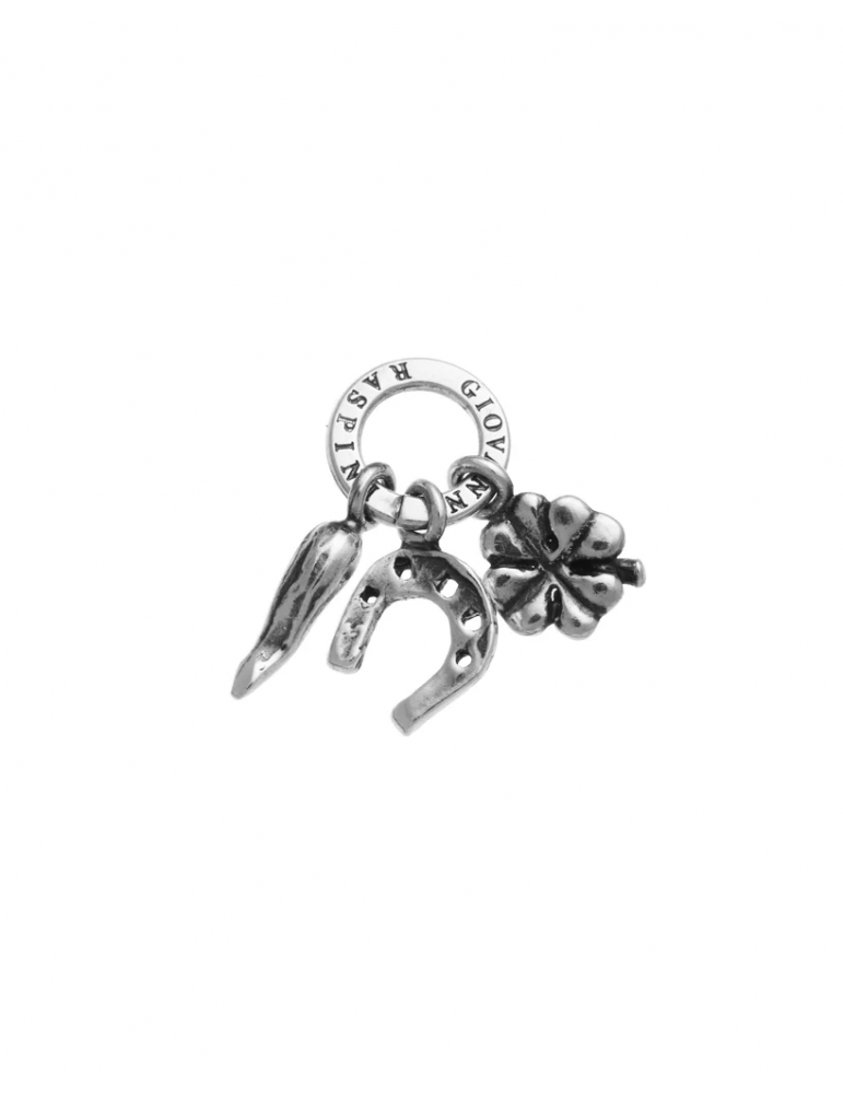Charm della collezione Giovanni Raspini Amuleti da donna. Colore: argento. Il charm è in argento 925‰ e rappresenta il tris di amuleti con un cornetto, quadrifoglio e un ferro di cavallo, munito di maglina con logo. I gioielli Giovanni Raspini sono interamente realizzati a mano in Italia.