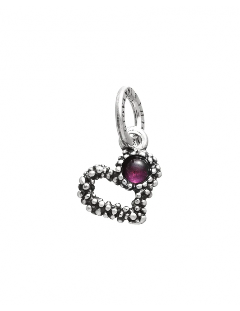 Charm della collezione Giovanni Raspini Cuori e Angeli da donna. Colore: argento e viola. Il charm è in argento 925‰ con pietra Siamite viola a forma di cuore, munito di maglina con logo. Peso: 2 gr. Altezza: 1,4 cm (esclusa maglina di 0,9 cm). I gioielli Giovanni Raspini sono interamente realizzati a mano in Italia.