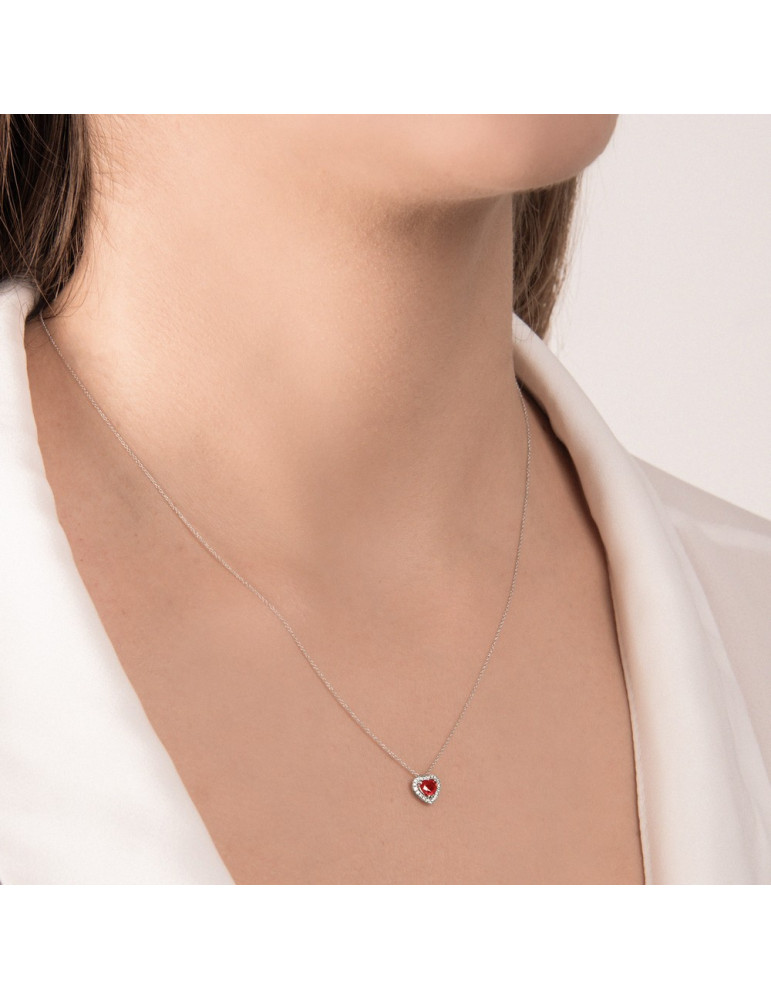 Collana donna Mirco Visconti ABA1044/10R con pendente e rubino a forma di cuore per un totale di 40 punti di carato (Ct. 0,40) provenienza Birmania, impreziosito da contorno di diamanti taglio brillante per un totale di 7 punti di carato (Ct. 0,07) colore G, purezza VS, in oro bianco 750 (18 carati kt).