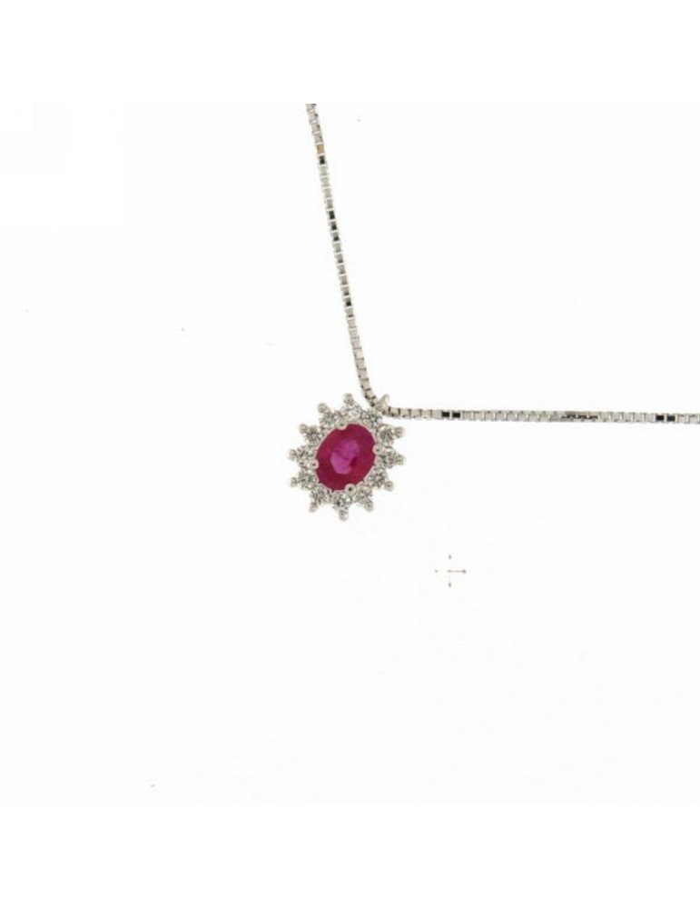 Collana donna Mirco Visconti DL2/B5R con rubino ovale per un totale di 35 punti di carato (Ct. 0,35) provenienza Birmania, impreziosito da contorno di diamanti taglio brillante per un totale di 14 punti di carato (Ct. 0,14) colore G, purezza VS, in oro bianco 750 (18 carati kt).