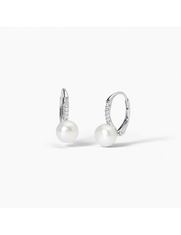 Orecchini da donna a monachella in argento rodiato con perle coltivate e zirconi bianchi.