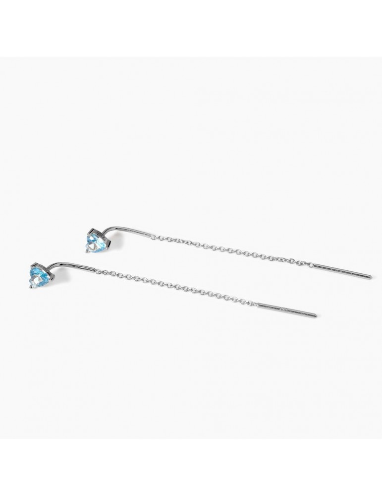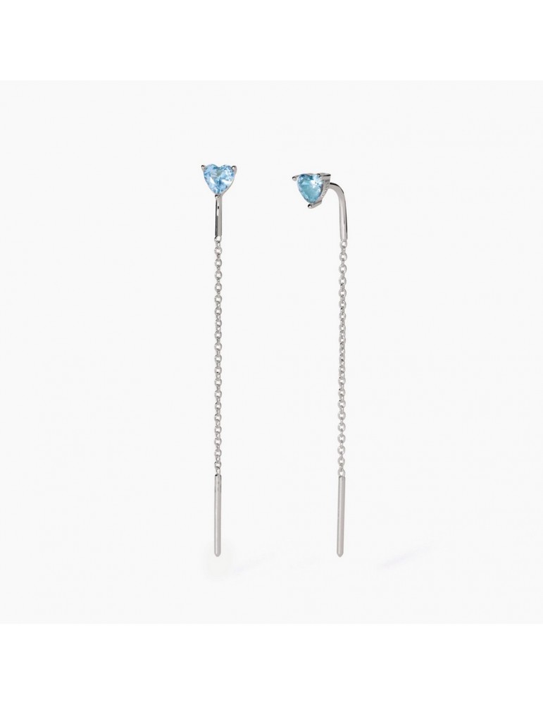 Orecchini pendenti da donna in argento rodiato con catena rolò e acquamarina sintetica taglio cuore.