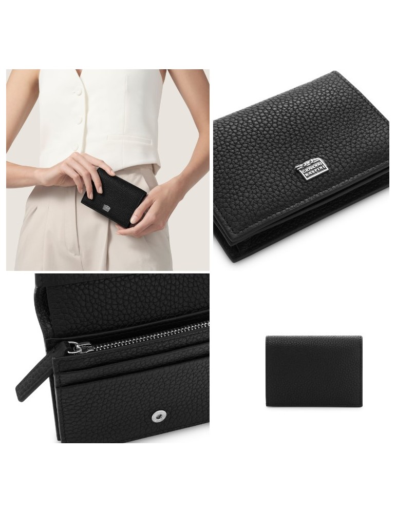 Un portafoglio spazioso e compatto, in pregiata pelle di vitello goffrata nera, dotato di una chiusura a bottone a pressione e 5 scomparti per carte di credito. La tasca portamonete a soffietto, munita di chiusura a zip, include sull'altro lato una tasca nascosta. Questo prodotto rappresenta la massima eccellenza artigianale che da sempre contraddistingue il brand Giovanni Raspini, ed è impreziosito da un caratteristico elemento in Argento 925, realizzato in fusione a cera persa e raffigurante il logo del brand in miniatura, sovrastato dall'iconico coccodrillo. Lavorato interamente a mano in Toscana. Un regalo di compleanno elegante e raffinato totalmente made in Italy.