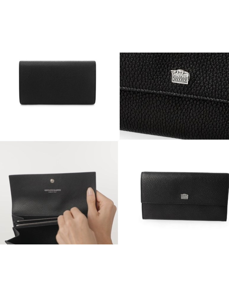 Un portafoglio capiente ed elegante, realizzato in pregiata pelle di vitello goffrata nera. Il modello è progettato per mantenere ogni cosa perfettamente organizzata ed offre ben 12 scomparti per carte di credito, due ampie tasche a soffietto per le banconote, una tasca portamonete con chiusura a zip: il tutto è protetto da una patta con chiusura a bottone, che nasconde anche una tasca supplementare. Questo prodotto rappresenta la massima eccellenza artigianale che da sempre contraddistingue il brand Giovanni Raspini, ed è impreziosito da un caratteristico elemento in Argento 925, realizzato in fusione a cera persa e raffigurante il logo del brand in miniatura, sovrastato dall'iconico coccodrillo. Lavorato interamente a mano in Toscana. Un regalo di compleanno elegante e raffinato totalmente made in Italy.