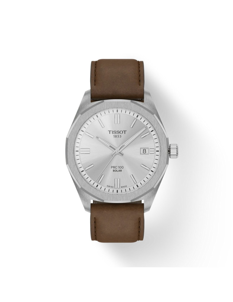 Introdotto per la prima volta a metà degli anni 2000, il PRC 100 grazie al suo design straordinario si è ritagliato da subito un posto nella collezione Tissot. Oggi ritorna con un movimento pionieristico Lightmaster Solar Quartz, che sfrutta l'energia fotovoltaica per alimentare ogni secondo. Con la sua cassa in acciaio da 39 mm e la lunetta dodecagonale, questo modello emana sicurezza. Sotto l'elegante vetro zaffiro si nasconde un movimento al quarzo a energia solare, progettato per ricaricarsi senza fatica sia con la luce naturale che con quella artificiale. L'indicatore di fine energia garantisce prestazioni ottimali, mentre la compatibilità con il cinturino da 20 mm consente di personalizzare il proprio stile, sia con la classica pelle che con le moderne opzioni milanesi. Questa versione solotempo con quadrante silver e citurino in pelle marrone rappresenta il regalo perfetto per il compleanno o la laurea di un uomo sportivo e dinamico che ama la precisione e il design top della casa svizzera. Idea regalo per testimone di nozze.