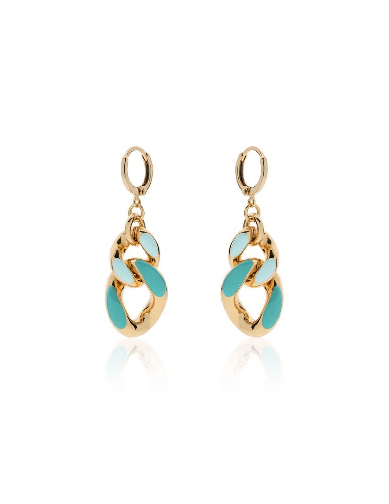 Orecchini in bronzo dorato con catena grumetta e smalto azzurro, con chiusura a monachella tonda. Dal design fluido ed elegante al vivace tocco di colore, questi orecchini sono il compagno perfetto 24 ore su 24, 7 giorni su 7. Abbina i tuoi outfit ai nostri orecchini groumette e ai gioielli coordinati. Gioca con il colore e le forme per stravolgere i tuoi look in un semplice gesto.