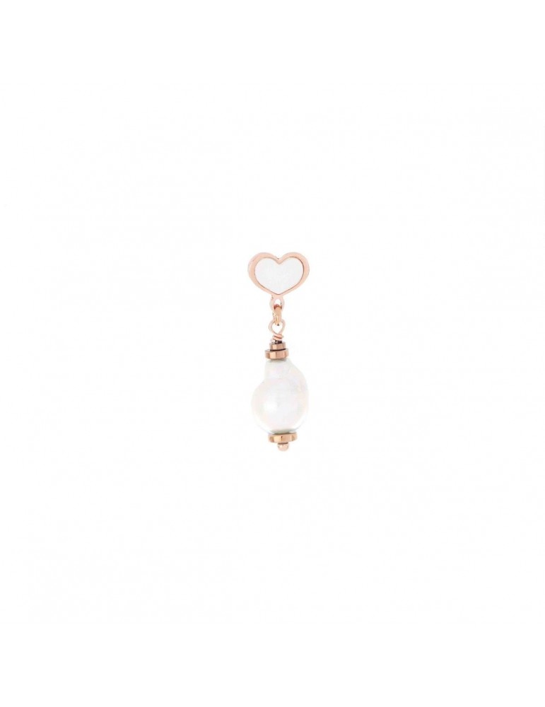 Orecchino a lobo singolo realizzato in argento 925 con galvanica oro rosa ad alto spessore e resistenza con Perla d'acqua dolce naturale e irregolare pendente. Il pendente presenta elementi decorativi come porzioni di cilindri un lobo cuore Maman con smalto. La lunghezza approssimativa dell'orecchino è di circa 2,5 cm e può variare a seconda della Perla. Questo orecchino rappresenta il regalo perfetto per la donna di classe con un look minimal ed elegante. Idea regalo per san valentino.
