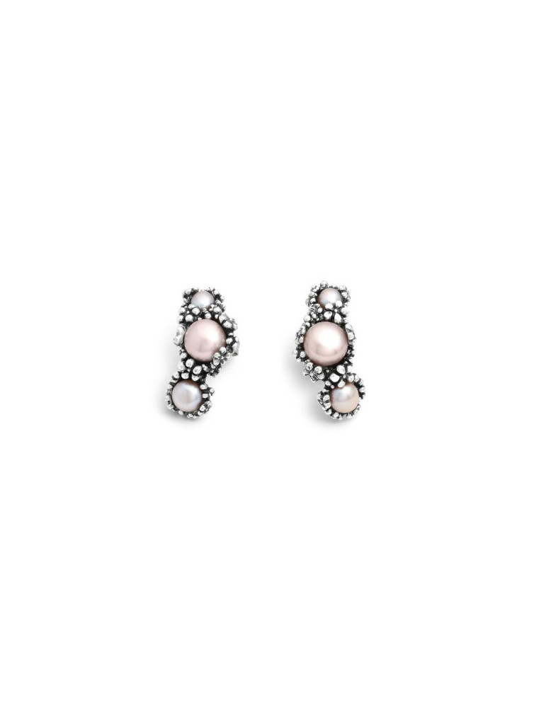 Orecchini dal fascino raffinato e senza tempo. Il motivo floreale in argento brunito, realizzato con l'antica tecnica della fusione a cera persa e illuminato dalla diamantatura artigianale, incastona sei perle d’acqua dolce rosa in tre dimensioni. Interamente fatto a mano in azienda.
