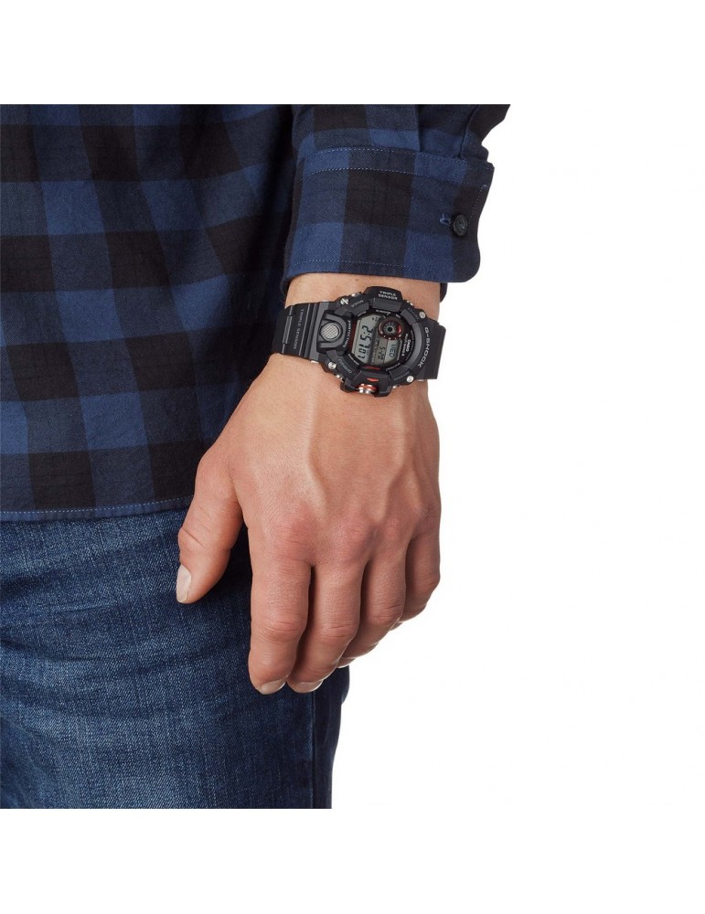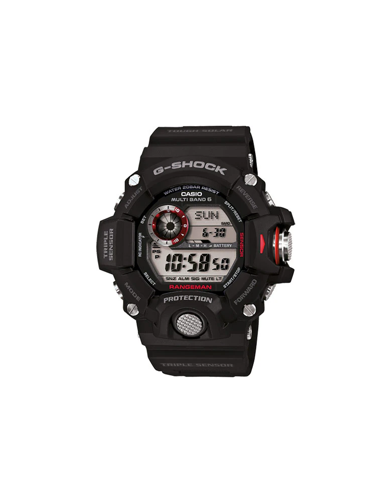 Ecco RANGEMAN, l'ultima aggiunta alla serie Master of G di orologi solidi e resistenti, disegnati e progettati per resistere alle condizioni più estreme immaginabili. RANGEMAN è dotato di sensore triplo che lo rende in grado di mantenere a portata di mano le letture di altitudine, pressione barometrica, temperatura e direzione. I pulsanti cilindrici offrono un funzionamento eccezionale e una migliore resistenza agli urti. Il pulsante del sensore utilizzato di frequente (al centro a destra) è dotato di un rivestimento in metallo che lo protegge dall'impatto laterale e impedisce l'ingresso di corpi estranei. Premendo il pulsante del sensore in qualsiasi modalità si passa direttamente a uno schermo del sensore. Ogni modalità sensore ha un proprio segnale acustico, il che significa che è possibile determinare la modalità di ingresso senza nemmeno guardare l'orologio. Tutto questo, oltre alla registrazione dell'ora con un solo tasto, alla misurazione del tempo trascorso con un solo tasto, alla solidità e alla durata del G-SHOCK, e molto altro ancora, rende RANGEMAN la scelta perfetta per rangers, personale di soccorso e chiunque altro la cui professione o le cui attività richiedono un'affidabilità senza pari.